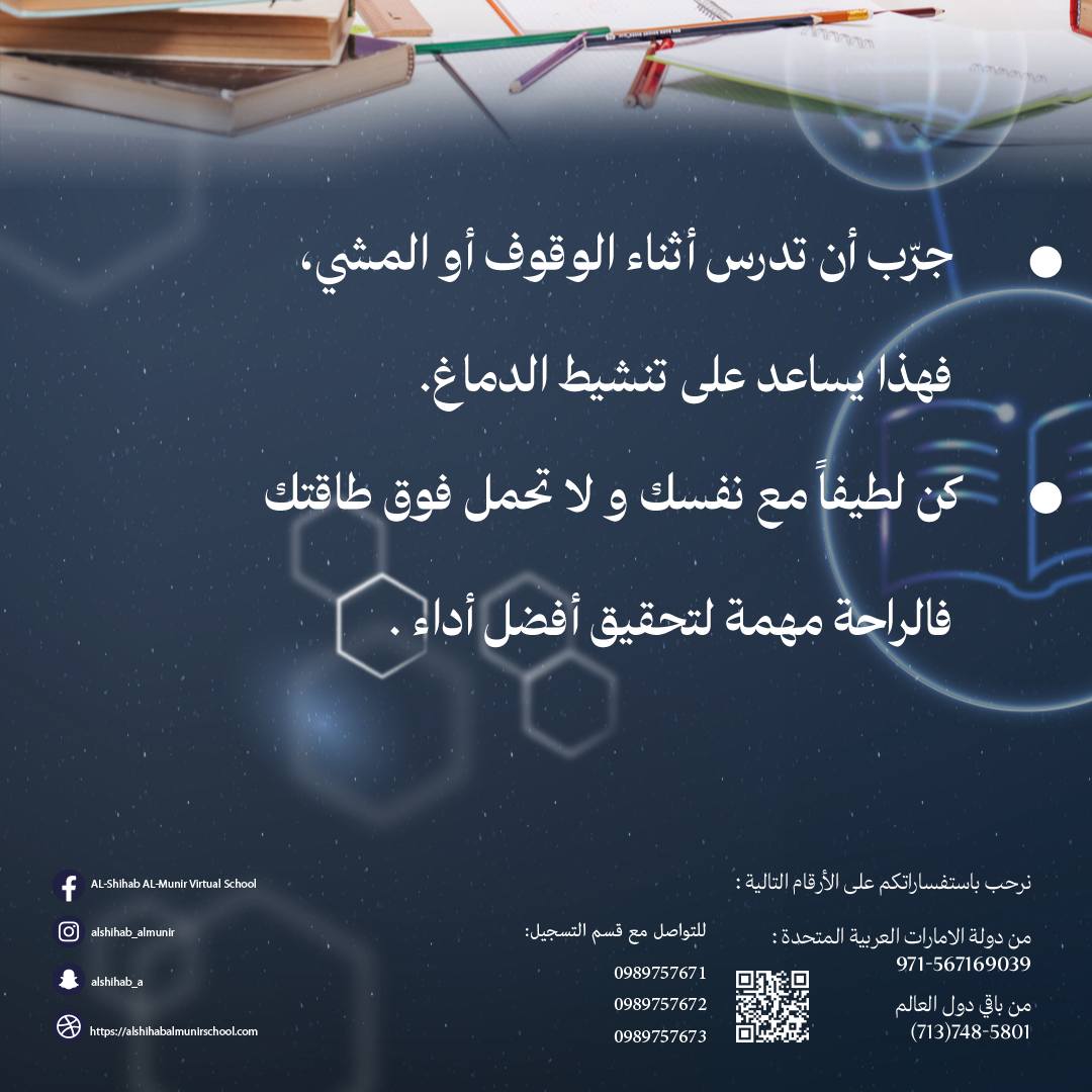 * حدد وقتاً معيناً لكل مادة، ولا تستسلم حتى لو واجهت صعوبة، الاستمرارية هي مفتاح النجاح.
