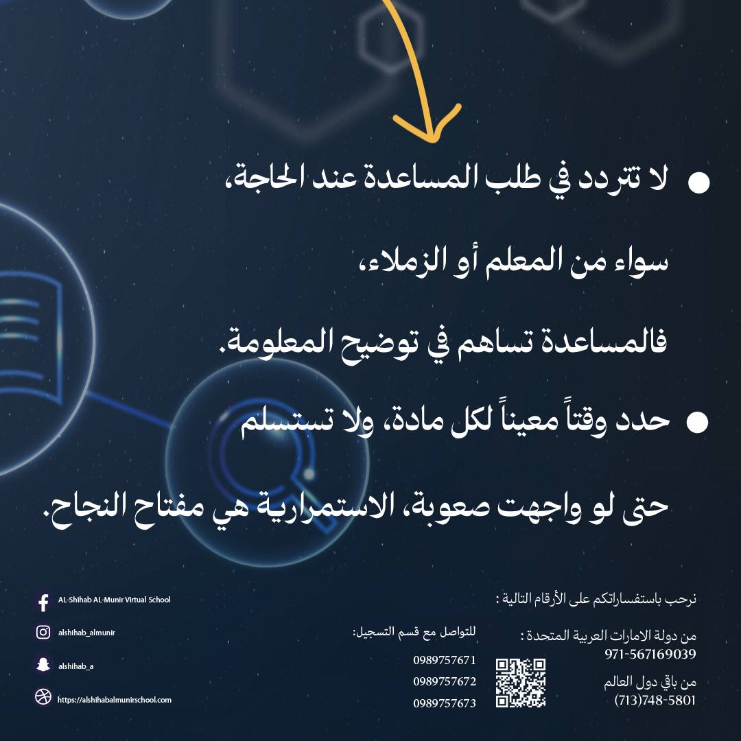 * لا تتردد في طلب المساعدة عند الحاجة، سواء من المعلم أو الزملاء، فالمساعدة تساهم في توضيح المعلومة.