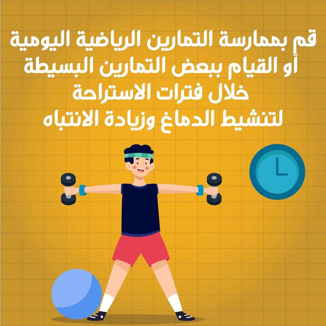 4- قم بممارسة التمارين الرياضية اليومية أو القيام ببعض التمارين البسيطة خلال فترات الاستراحة لتنشيط الدماغ وزيادة الانتباه.