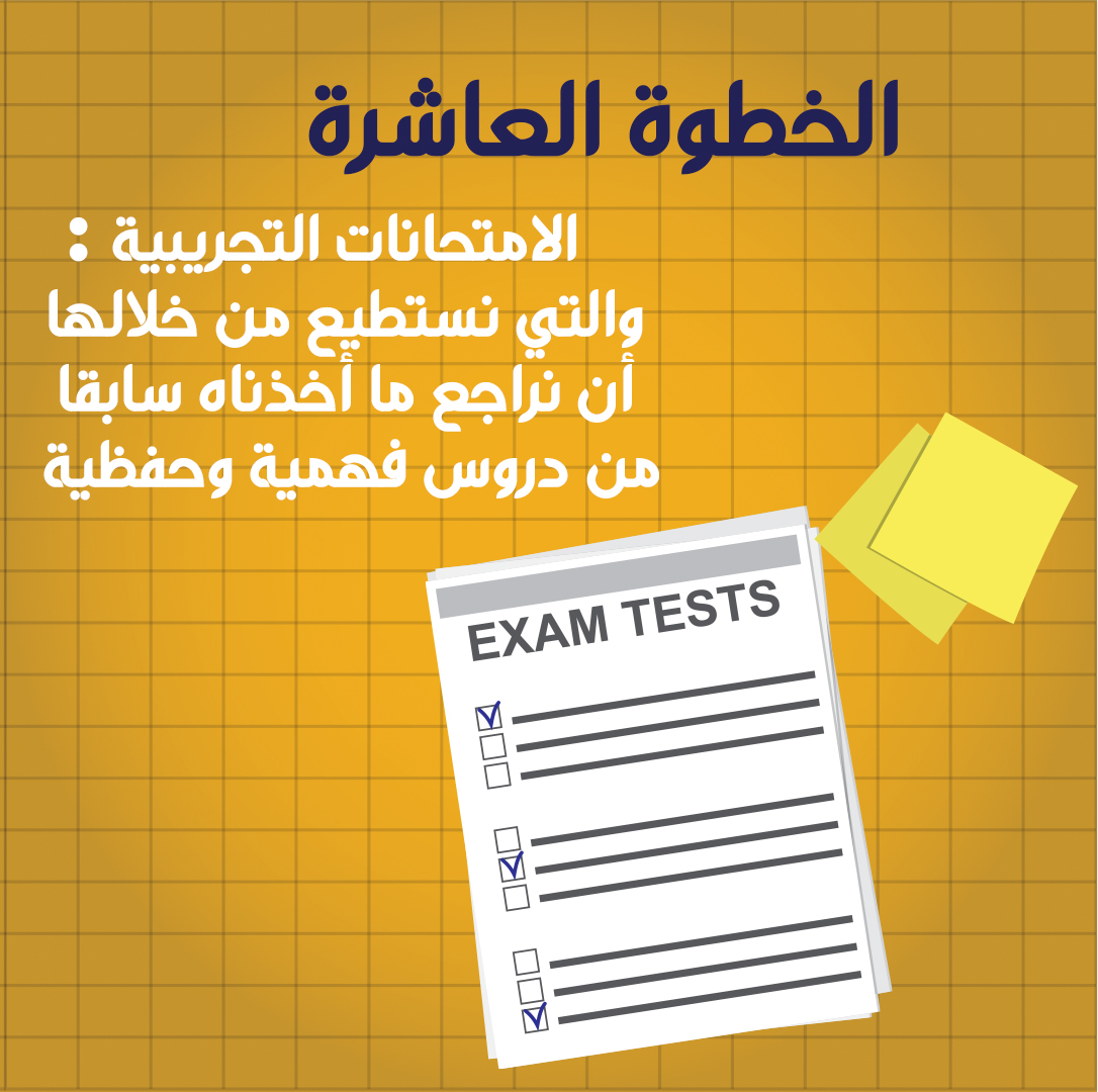 10- الخطوة الأخيرة والأهم هي إجراء اختبارات تجريبية نراجع من خلالها جميع دراسات الفهم والحفظ السابقة.